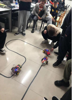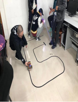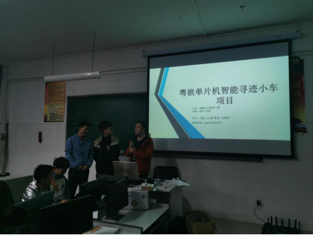 4月11晚上六点开始,员工开始进行项目路演答辩,员工们将三天来的成果,智能小车放入赛道,进行行驶展示,并分组在PPT上进行项目介绍和答辩。